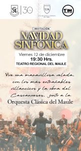 La Universidad Autónoma de Chile, Sede Talca, junto al Colegio Alborada de Linares, invitan a la comunidad escolar a participar del concierto Navidad Sinfónica, una experiencia musical especialmente pensada para celebrar el espíritu navideño en familia. La actividad se realizará el viernes 12 de diciembre, a las 19:30 horas, en el Teatro Regional del Maule.