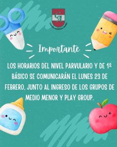 Los horarios correspondientes a Educación Parvularia y 1° Básico serán enviados el lunes 23 de febrero, junto con la información de los grupos de ingreso de Nivel Medio Menor y Play Group.